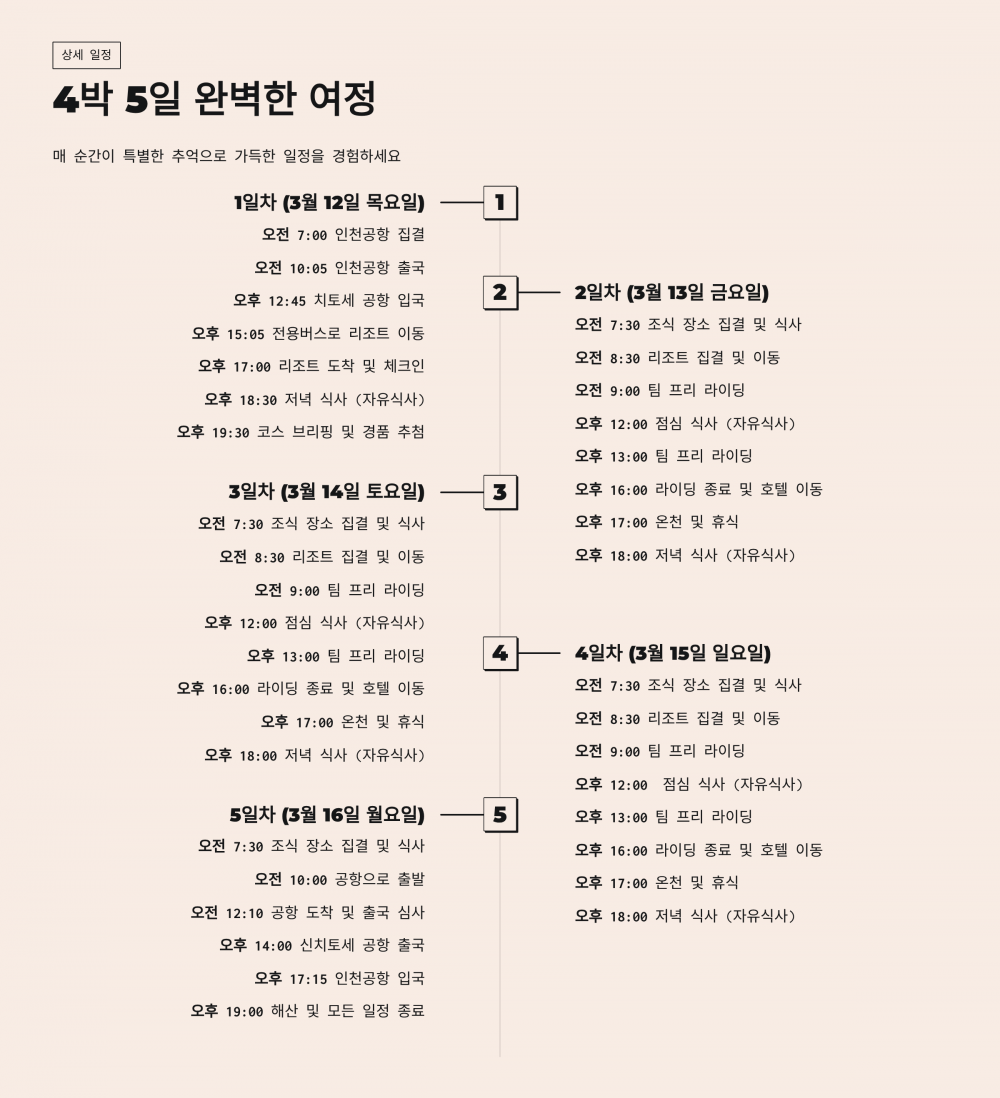 교통: 리무진버스 (15:05 출발) BIG RUNS BUS로 루스츠리조트로 이동(약 2시간 소요)